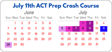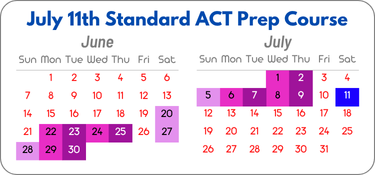 If you are interested in registering for either the Standard Course or the Crash Course for the July 11th ACT test, please fill out the registration form below and pay the full amount to secure a seat in the class. We have several class options, and there will be make-up classes available by request. There are no classes on Father's Day (June 21st) or Independence Day (July 4th).